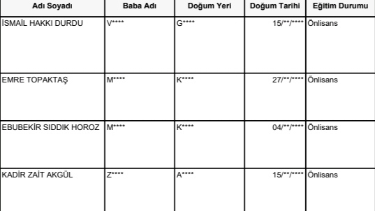 Türkiye İş Kurumu tarafından Kurumumuza gönderilen engelli beden işçisi listesi