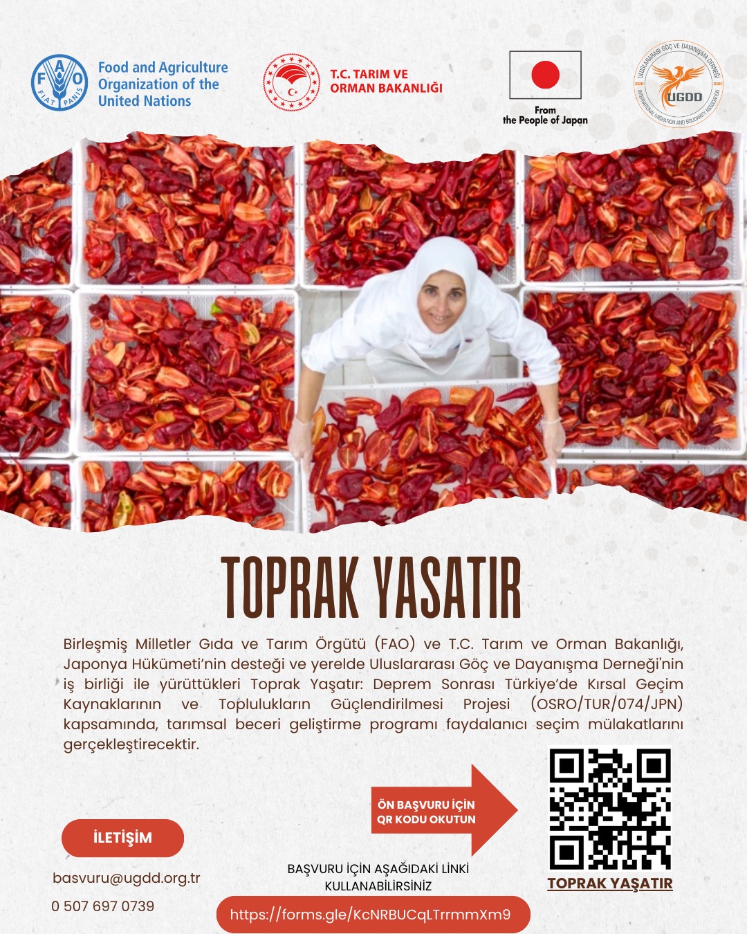 Birleşmiş Milletler Gıda ve Tarım Örgütü (FAO) ve T.C. Tarım ve Orman Bakanlığı, Japonya Hükümeti’nin desteği ve yerelde Uluslararası Göç ve Dayanışma Derneği'nin iş birliği ile yürüttükleri Toprak Yaşatır: Deprem Sonrası Türkiye’de Kırsal Geçim Kaynaklarının ve Toplulukların Güçlendirilmesi Projesi (OSRO/TUR/074/JPN) kapsamında, tarımsal beceri geliştirme programı faydalanıcı seçim mülakatlarını gerçekleştirecektir.